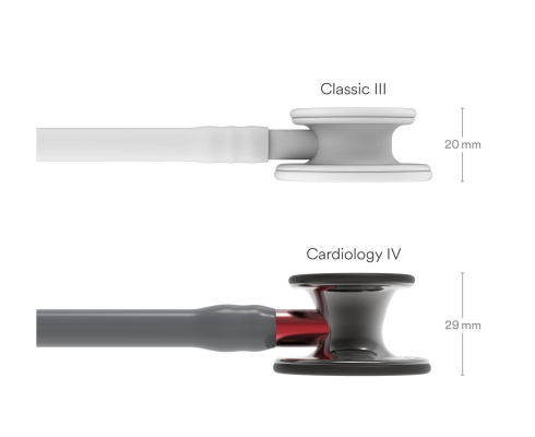 - Ergonomická a prepracovaná konštrukcia – o 40 % väčší hrudný snímač a o 60 % hlbší zvon v porovnaní s fonendoskopom 3M™ Littmann® Classic III™