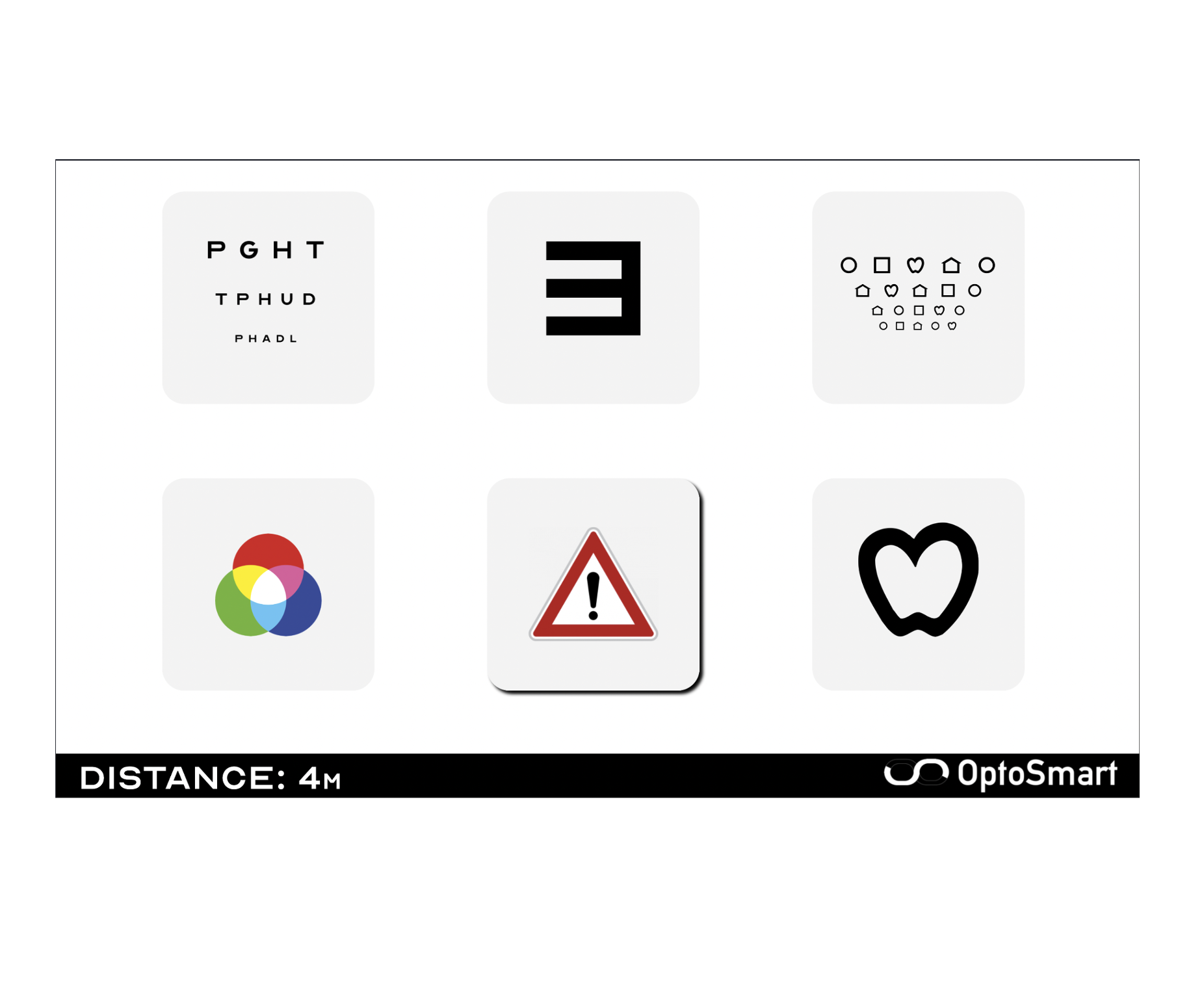 Najčastejšie používané vyšetrenia zraku a sluchu v OptoSmart zahŕňajú: Písmená a číslice (Sloan),Pflüger E, Pflüger ETDRS, Spektrum, LEA Standard, LEA Mod. ETDRS, Landoltove kruhy, Landoltove kruhy ETDRS, Farbocit, Farbocit deti, test vodičský preukaz, Semafor, LEA Extended, Audio testy – pre deti / pre dospelých.
